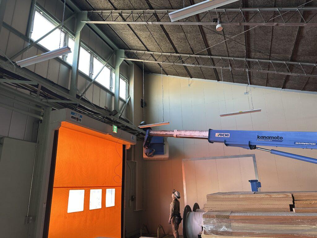 建物間は架空で、屋内はケーブルラックや電線管で配線し高所作業車や脚立を使用して期日内に納めることが出来ました。